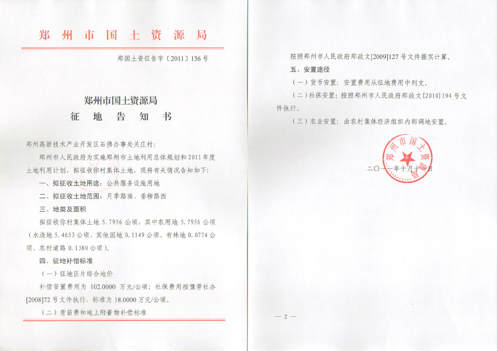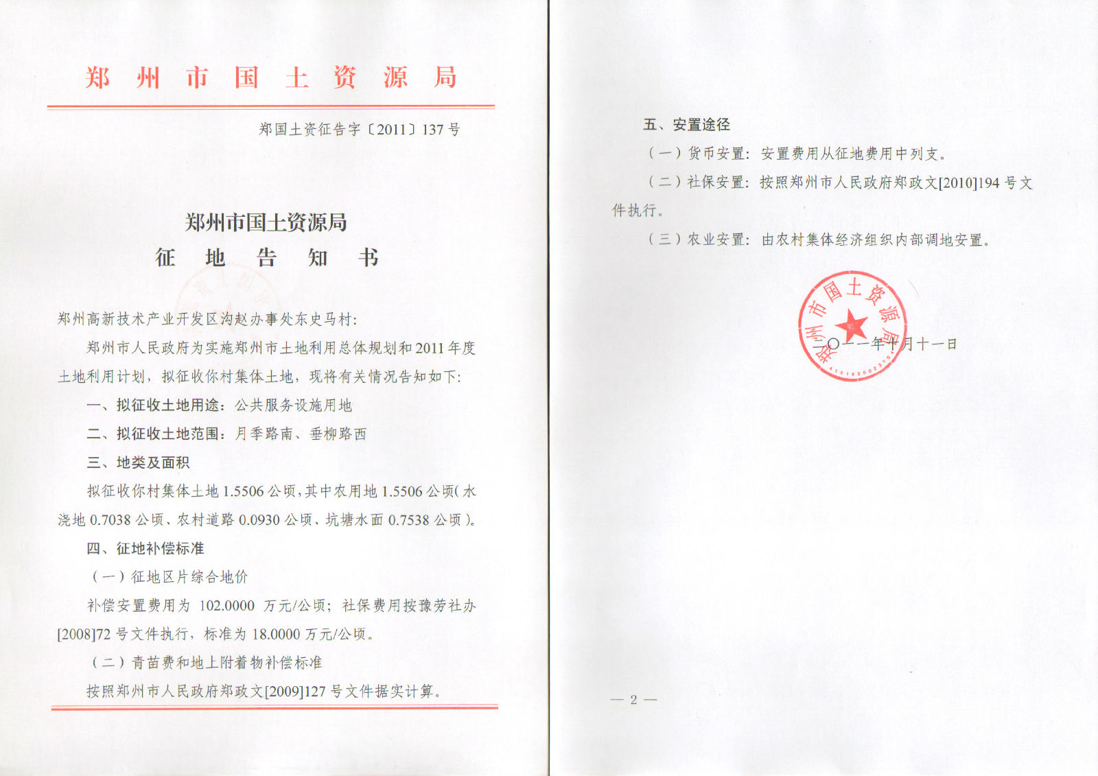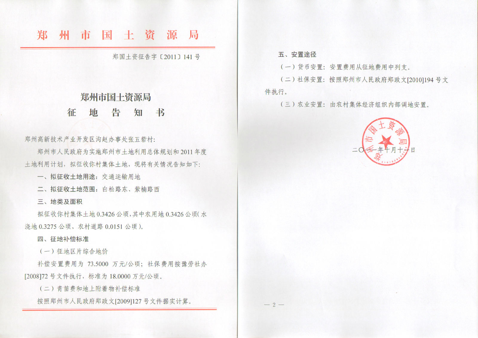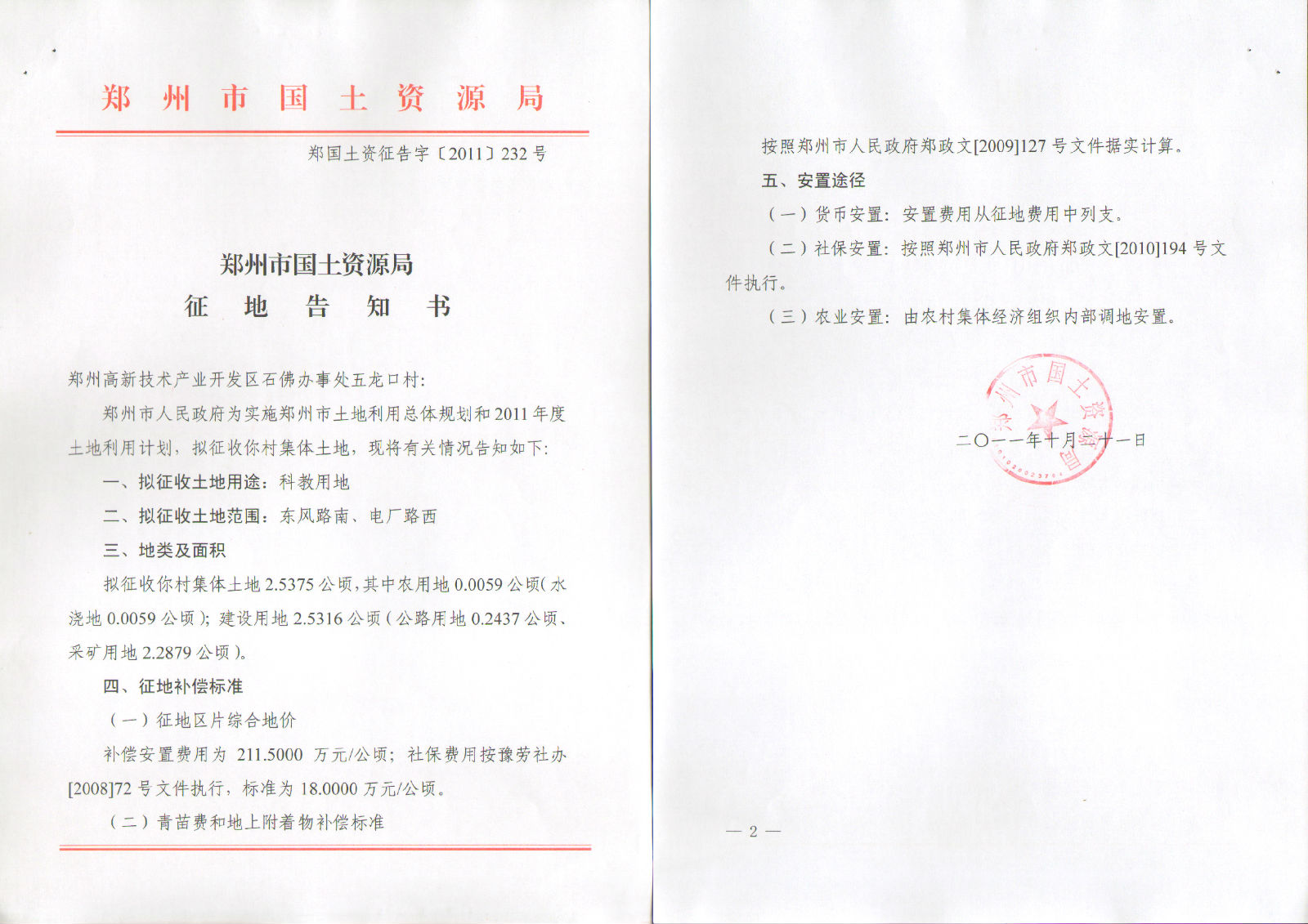2011年城市第一批实施征地告知书(五龙口村、东史马村、葛寨村、关庄村、兰寨村、张五砦村、水牛张村、牛砦村、石佛村)