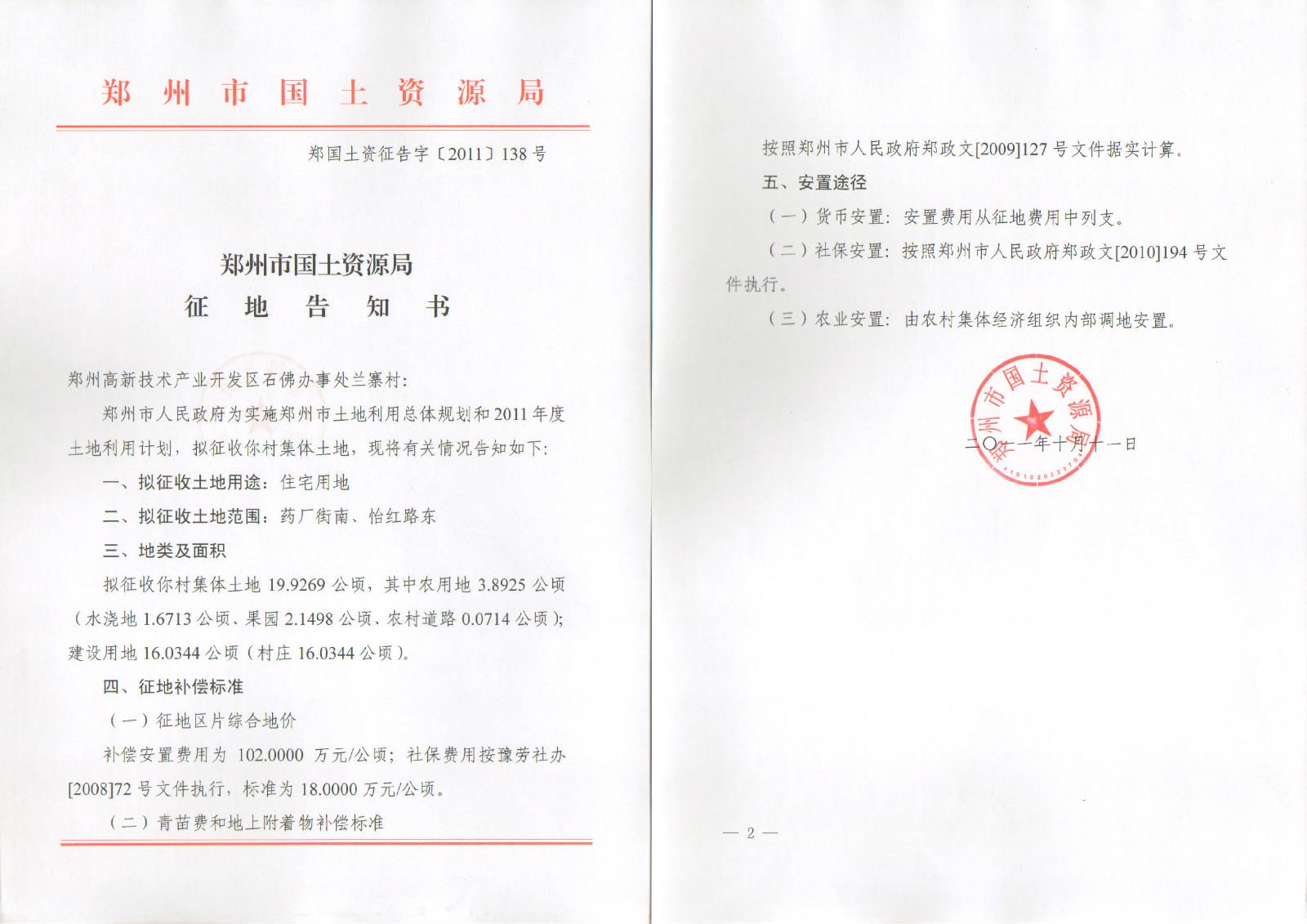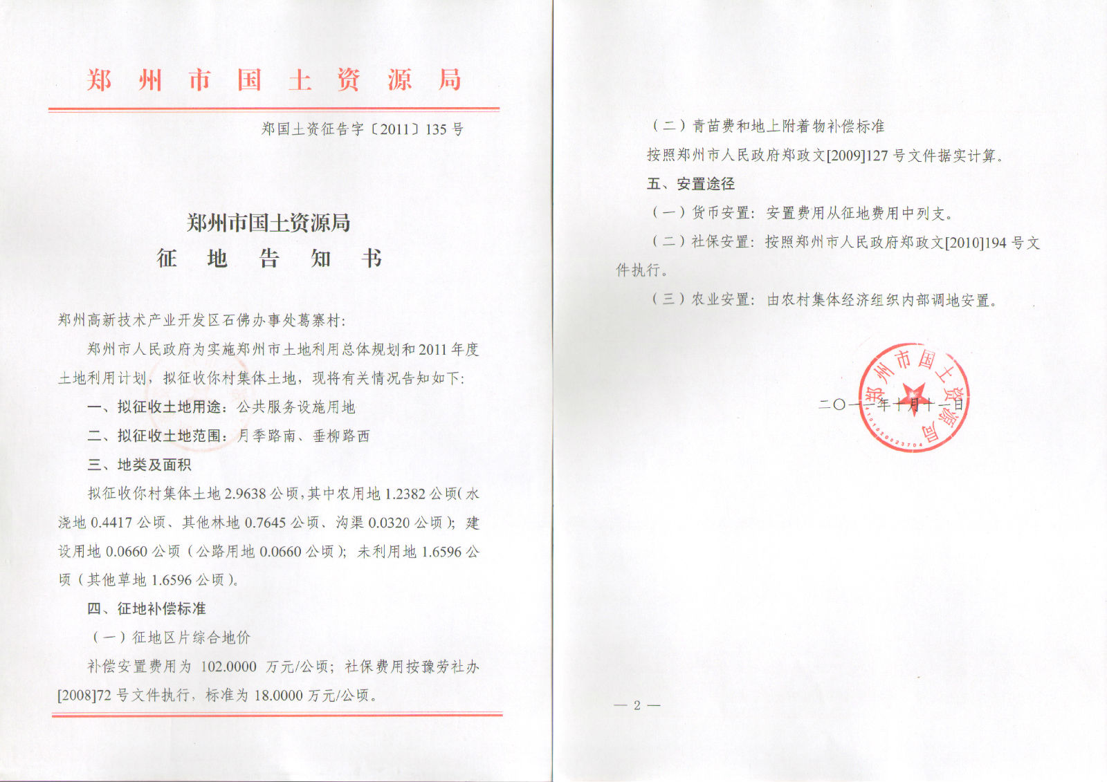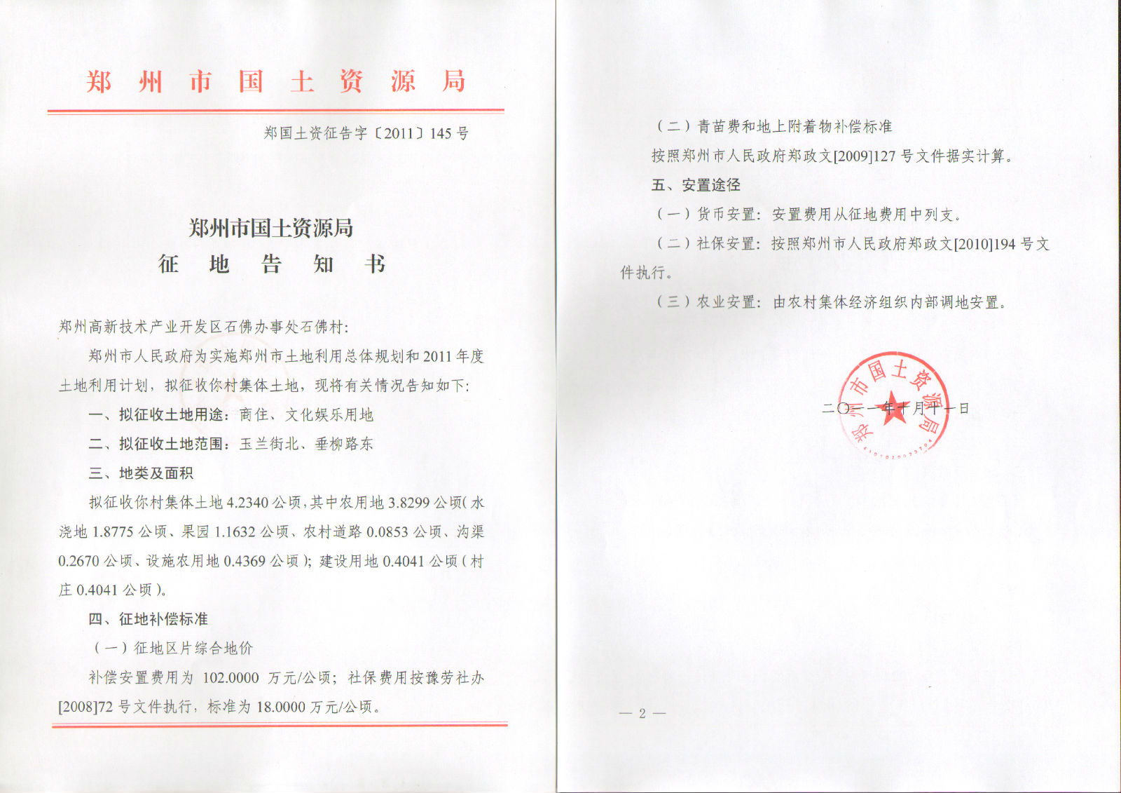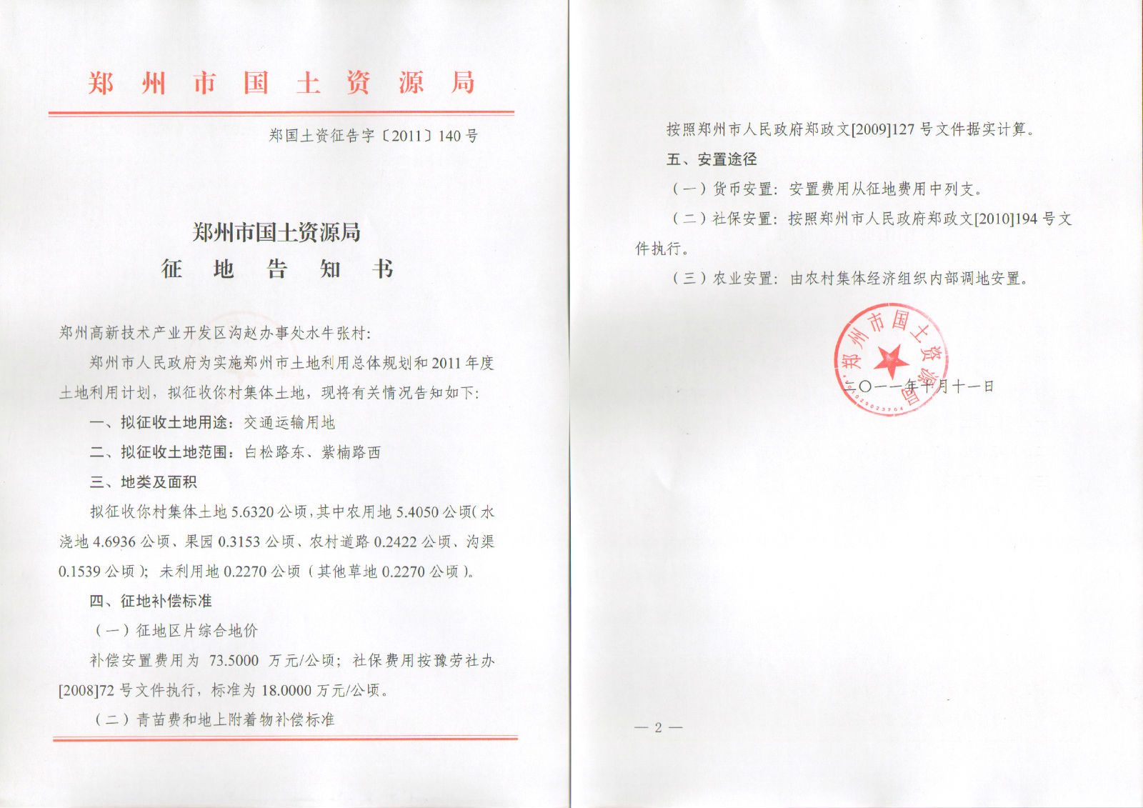 2011年城市第一批实施征地告知书(五龙口村、东史马村、葛寨村、关庄村、兰寨村、张五砦村、水牛张村、牛砦村、石佛村)