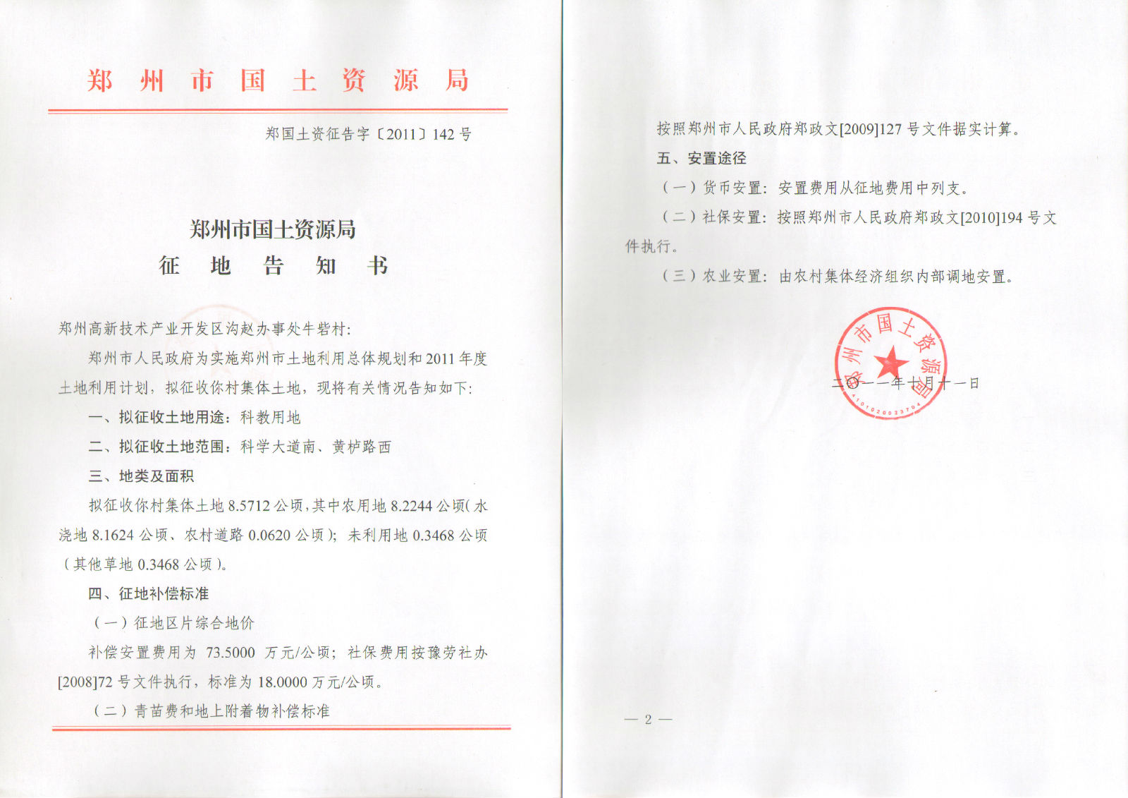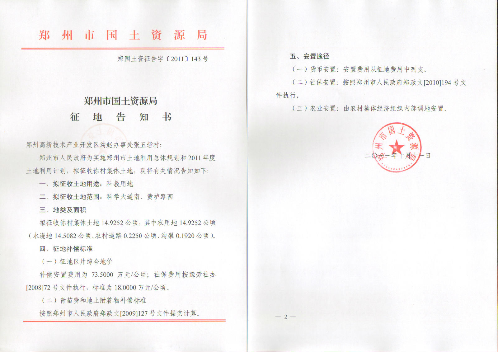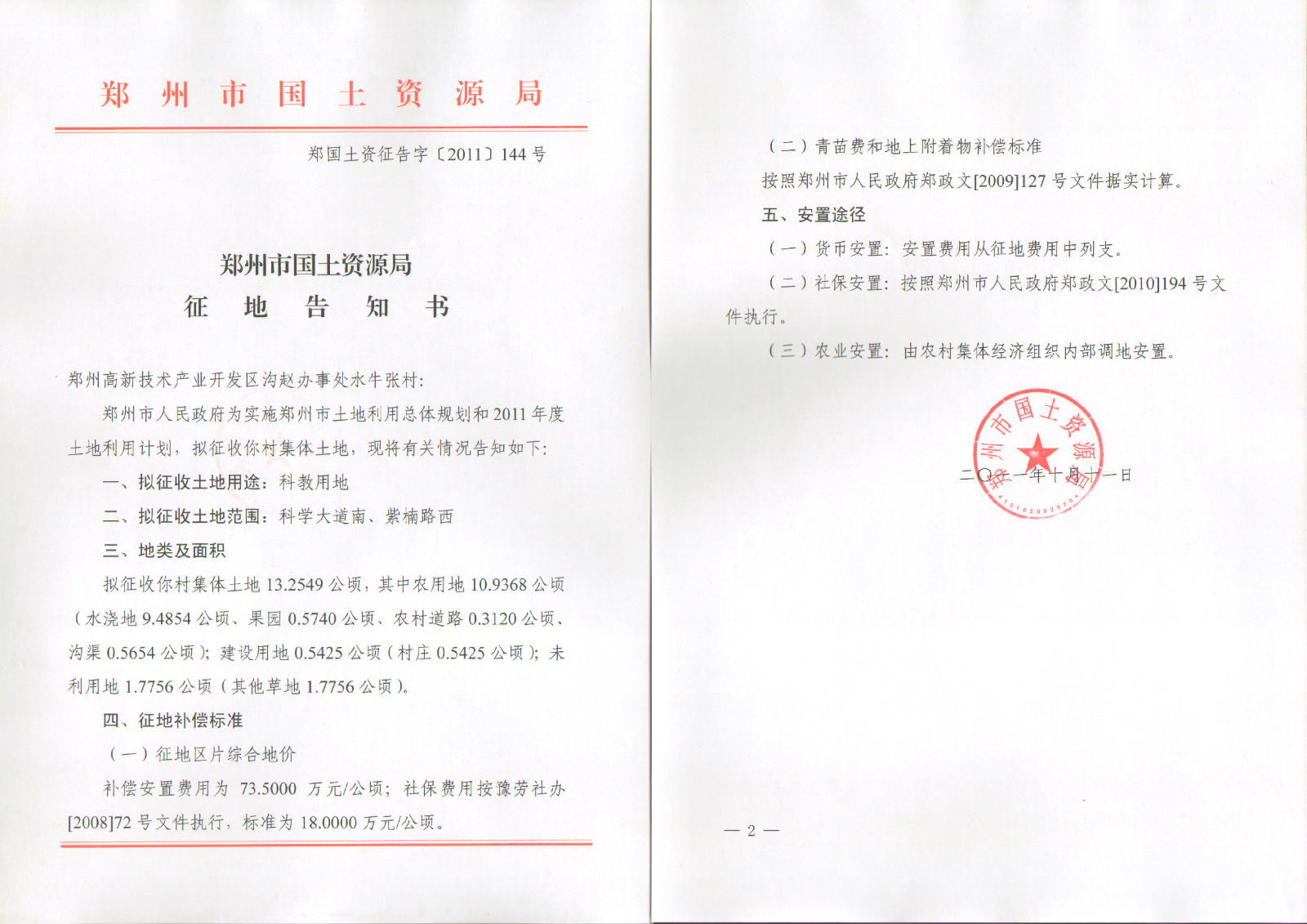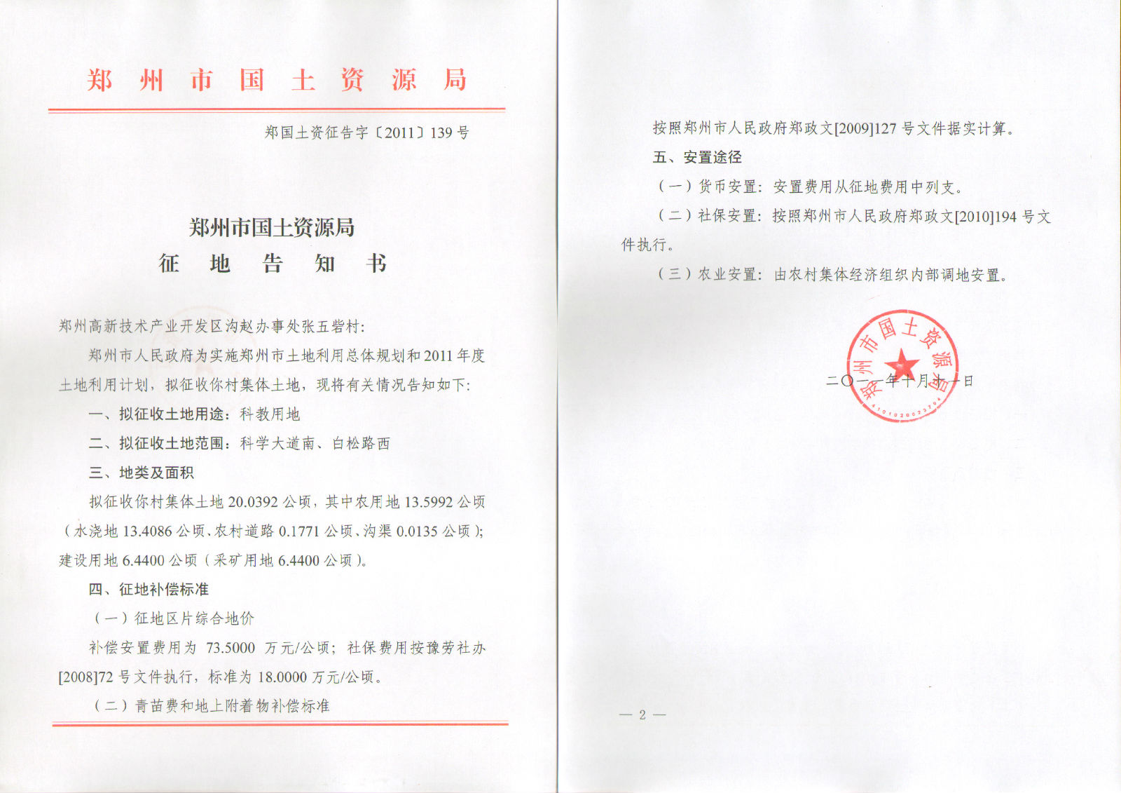 2011年城市第一批实施征地告知书(五龙口村、东史马村、葛寨村、关庄村、兰寨村、张五砦村、水牛张村、牛砦村、石佛村)