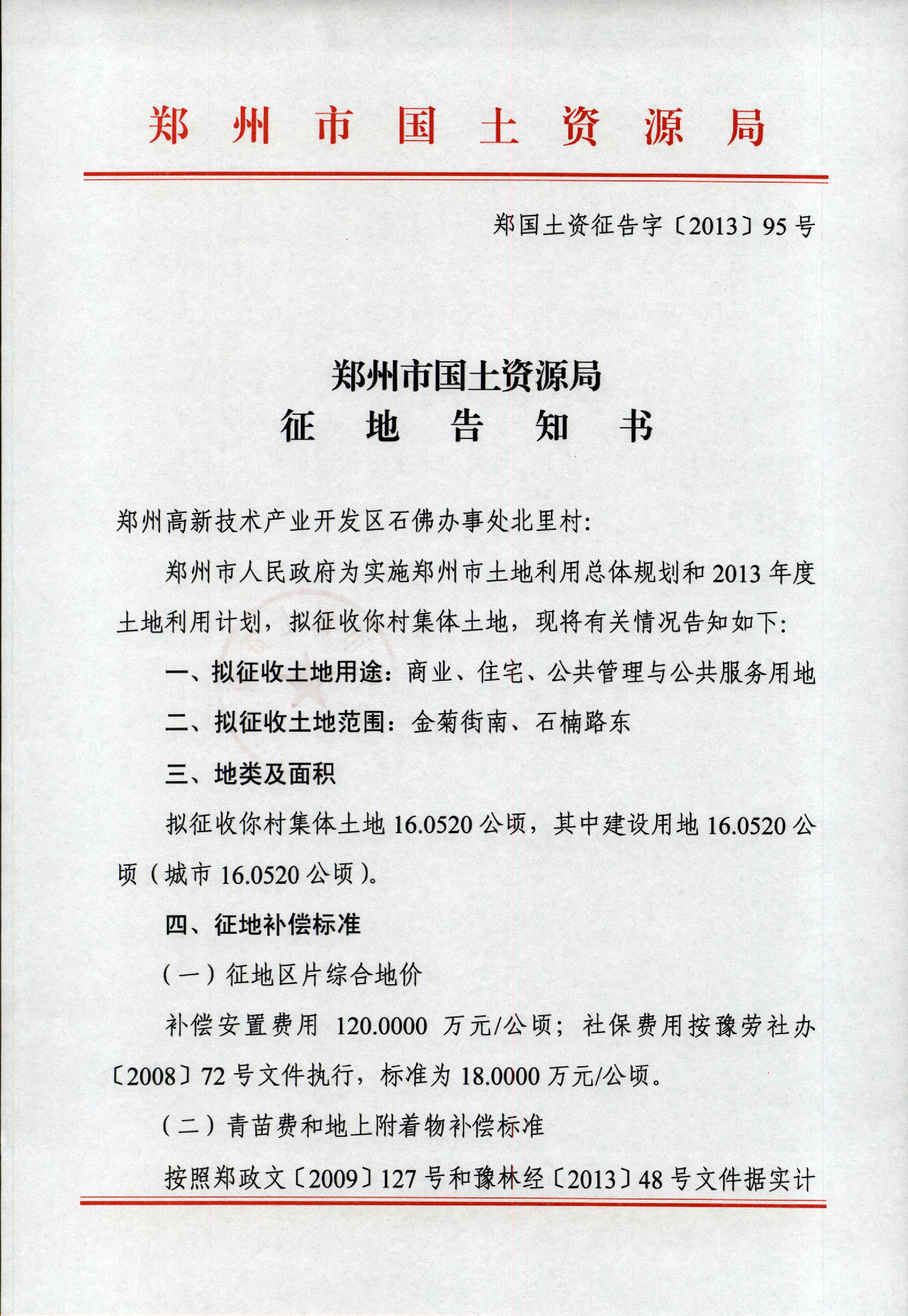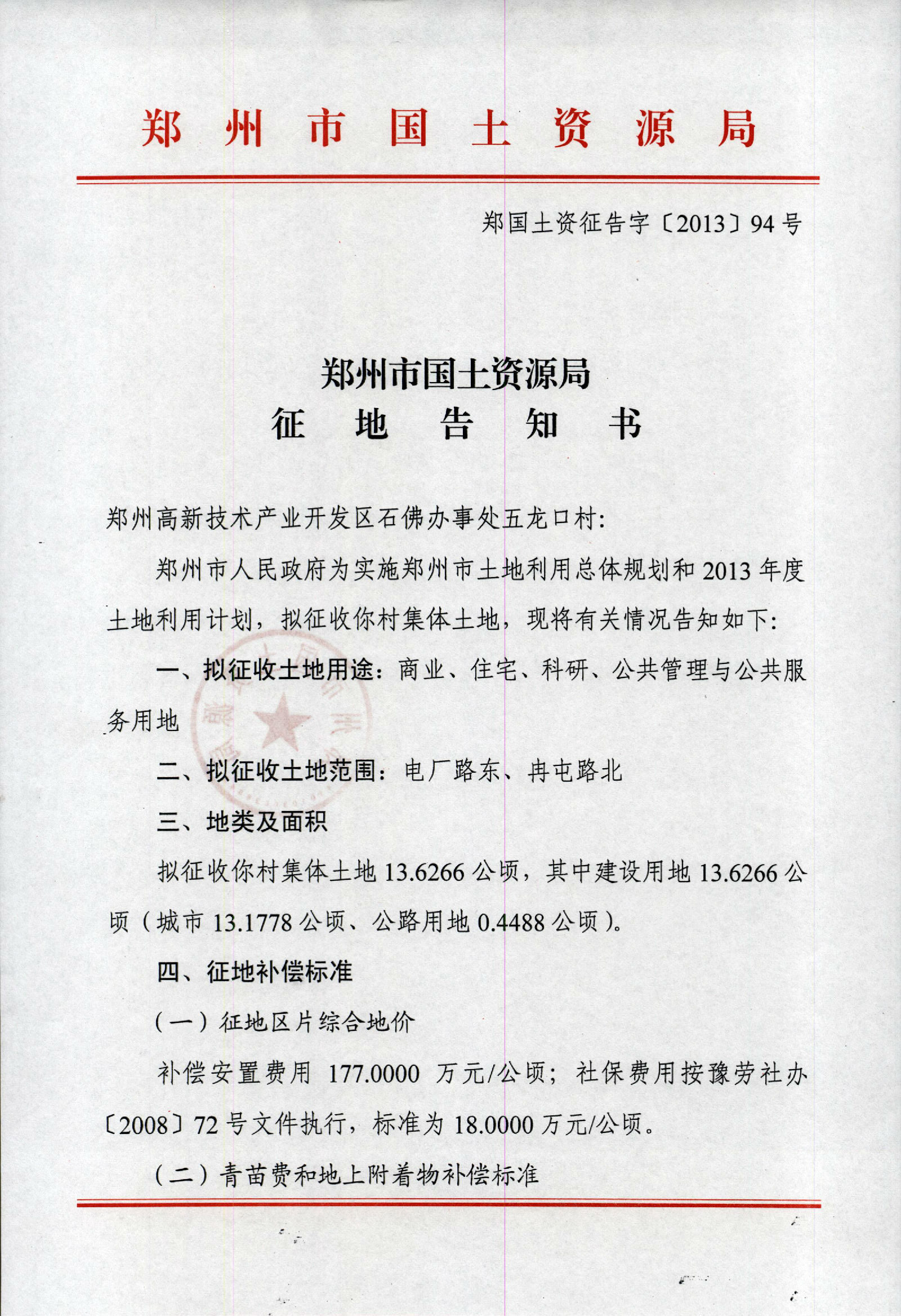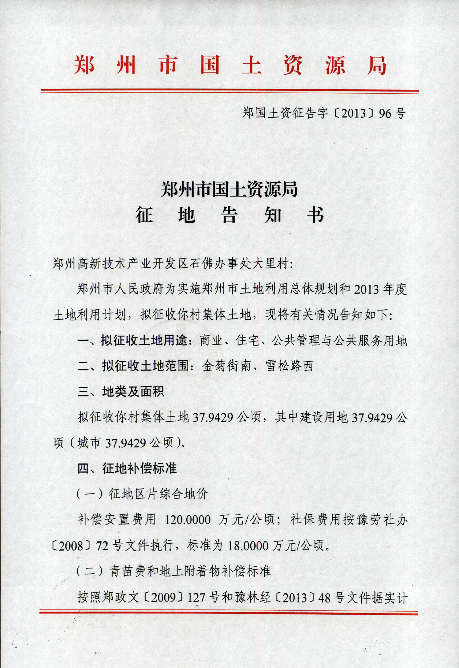 2013年城市第一批实施征地告知书(北里村、大里村、五龙口村)